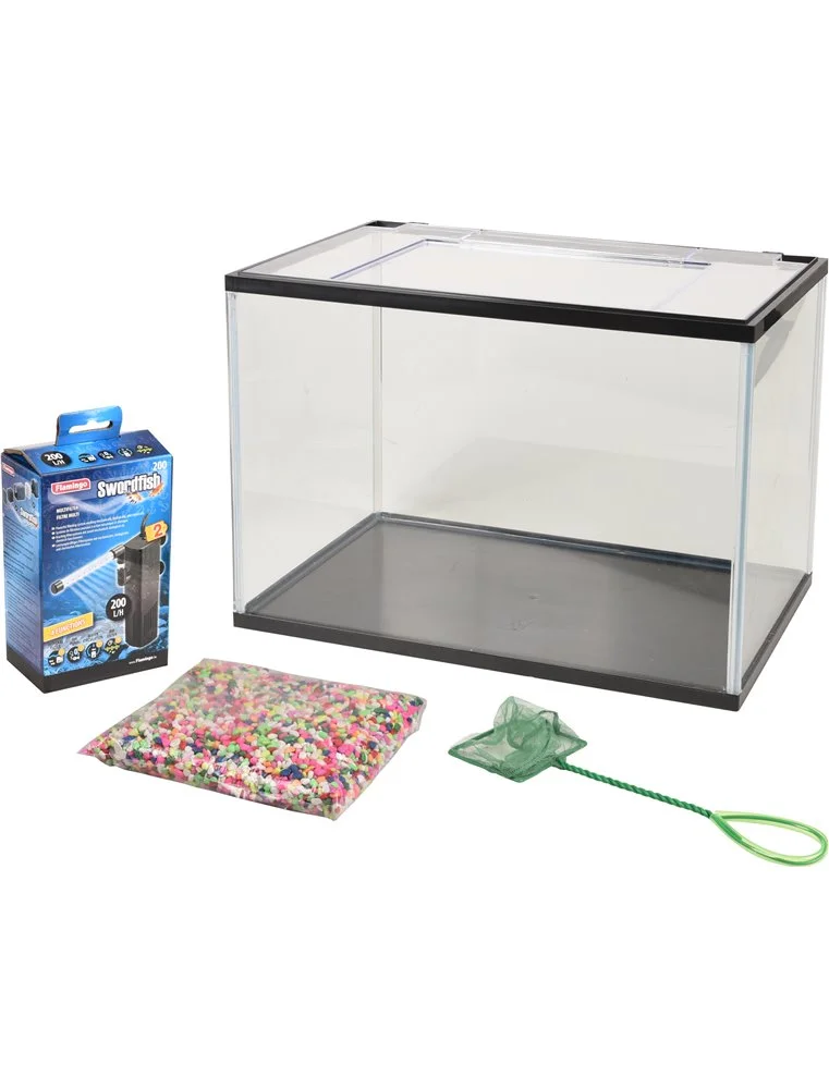 Flamingo aquarium set Lollipop 16 liter. Een starters set voor de kleine visliefhebbers onder ons. Een heus aquarium compleet geleverd met binnen filter, gekleurd siergrind en schepnetje. Afmeting: 36 x 22 x 26 cm, Inhoud: 16 liter